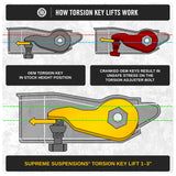 NOTES: Front torsion keys are adjustable anywhere from 1" to 3". A torsion bar puller (can be rented at most chain auto stores), or 5 ton gear puller is required for install. We also offer this tool with our kits in our other listings. An alignment is always recommended after altering the height of your vehicle.